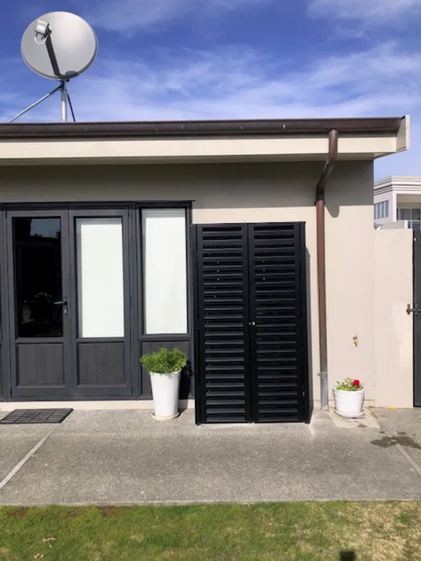 This is a “flatpack” item, for quick dispatch or pick up. Easy to setup and install. Construction Aluminium pressed louvres giving maximum air flow and rigidity. Top lid panel is perforated and has two reinforcing ribs for added strength. The double door front allows easy removal/exchange of bottles. Plus, there are drop bolts (top and bottom of one door) along with a stainless lockable latch for security. All hinges, drop bolts and latch are pre fitted making for amazingly easy installation. Oven baked black powder coating.