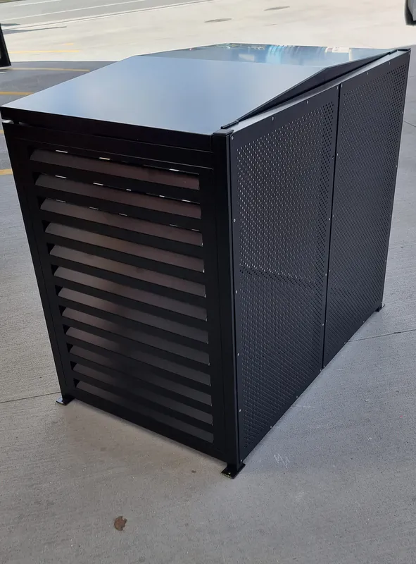 Smart looking and durable aluminium with pressed louvres giving air flow and rigidity. The top lid is hinged and supported by as struts allowing you to load your wheelie bin with ease, hands free. The rear perforated panel allows you to position your EasyScreen in an open area or against a wall and looks fantastic from any view.