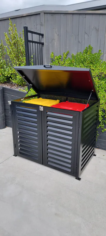 - When the screen top is raised with the gas strut assisting, the wheelie bin lid will lift open at the same time allowing you to load your bin with rubbish with both hands.
